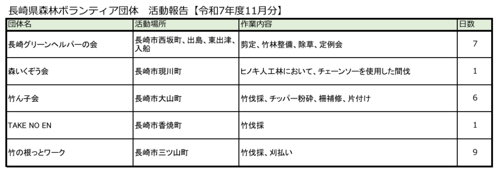 2025年12月15日 / 最終更新日時 : 2025年12月15日 nagasaki-shinrin_admin 活動報告 ボランティア団体活動報告【R7年度11月分】 令和7年11月の森林ボランティア団体活動報告がありました。団体、内容等は以下の通りです。 森林ボランティア活動報告R7年度‗11月ダウンロード