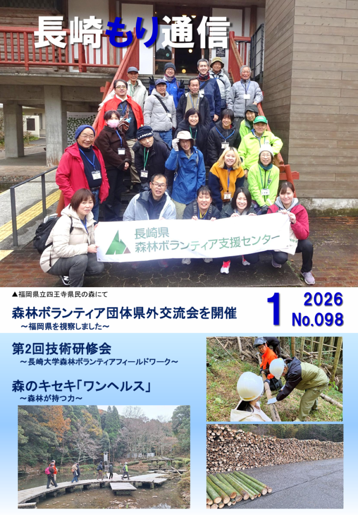 2026年1月26日 / 最終更新日時 : 2026年1月26日 nagasaki-shinrin_admin 長崎もり通信 長崎もり通信098号 【目次】 特集・森林ボランティア団体県外交流会を開催 ・第2回技術研修会 ~長崎大学森林ボランティアフィールドワーク~ ・安全講習会 長崎地区 ・森のキセキ「ワンヘルス」 ・センターからのお知らせ もり通信098ダウンロード