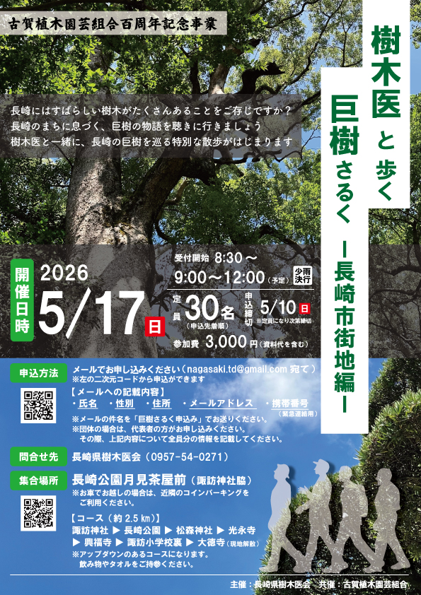 2026年4月13日 / 最終更新日時 : 2026年4月13日 nagasaki-shinrin_admin 未分類 樹木医と歩く巨樹さるく【お知らせ】 長崎県樹木医会さんよりお知らせです。樹木医と歩く巨樹さるく🌳~長崎市街地編~を開催されます。何十年も生き続け、長崎の街にたたずむ巨樹。樹木医さんのお話を聞ける貴重な機会です!みなさん奮ってご参加ください。 巨樹さるくチラシダウンロード