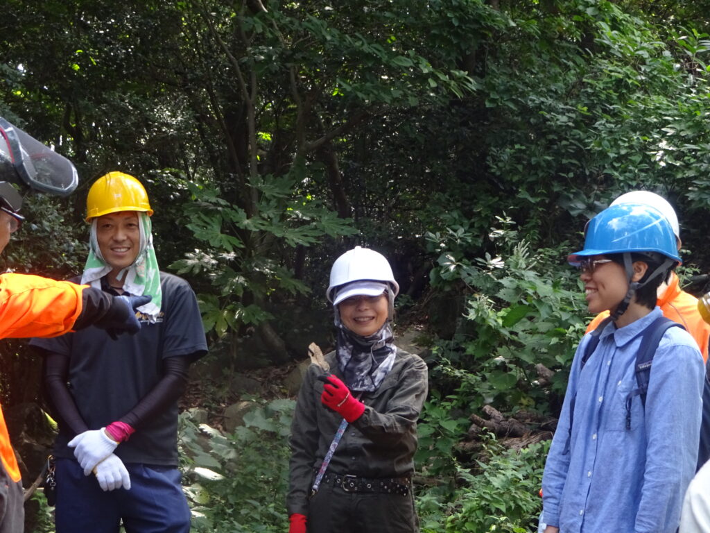 1班は森林整備を行いながら散策路を作ったり、整備した枝や葉を集積したりする体験をしました。